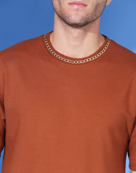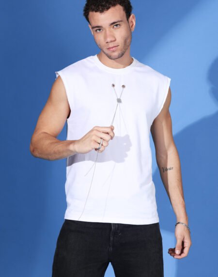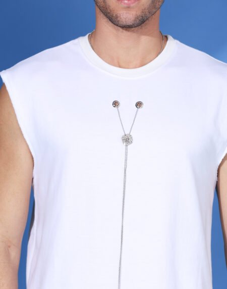 A crisp white, sleeveless vest with a unique, built-in bronze chain necklace detail.