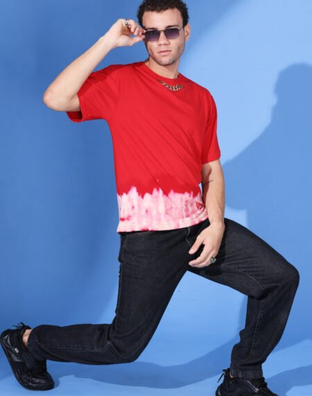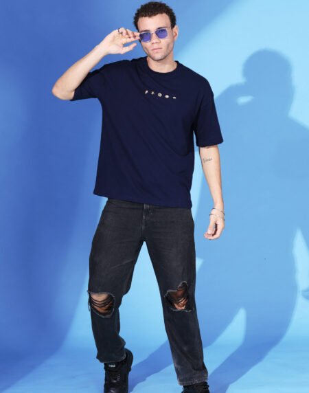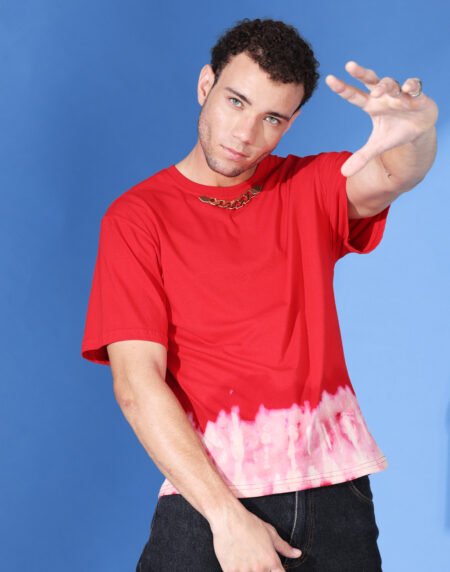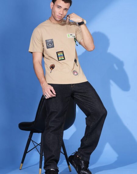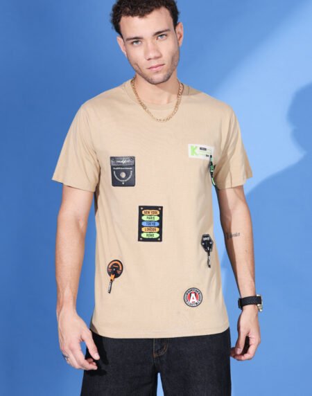 A unique, skin-toned t-shirt with decorative badges on the sleeves for a touch of flair.