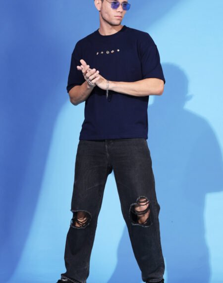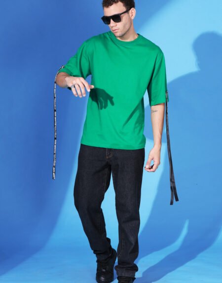 A dark green t-shirt with unique, decorative straps on the collar for a subtle edge.