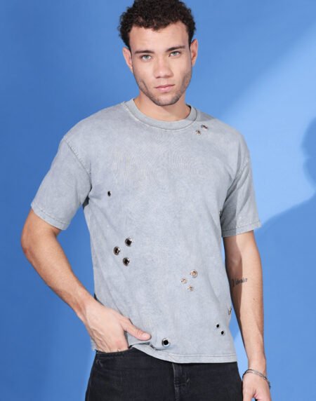 A light grey, washed-out t-shirt with strategically placed grommet holes for a distressed, grunge look.