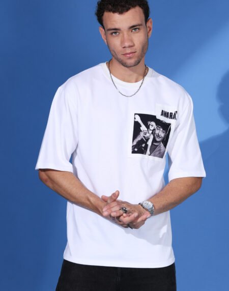 A clean white t-shirt with a stylish, black and white graphic pocket.