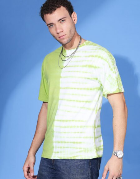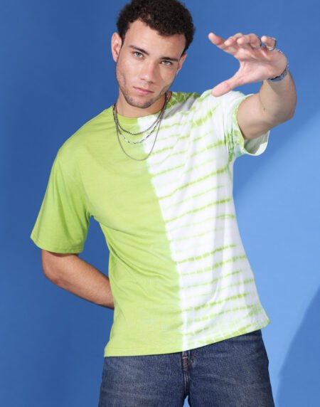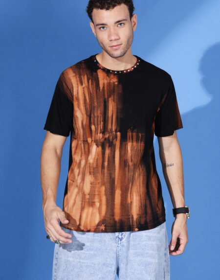 A striking tie-dye t-shirt with a unique, vertical pear and black color combination.