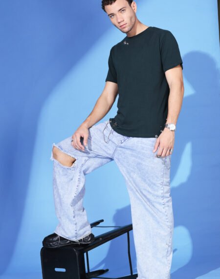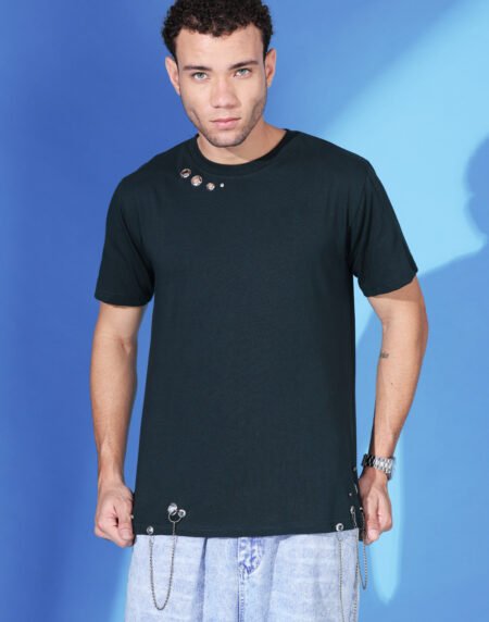 A dark green t-shirt with unique, decorative straps on the collar for a subtle edge.