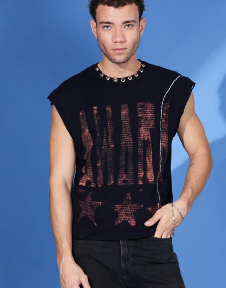 A black, sleeveless vest with a distressed, vintage-inspired graphic and star details.